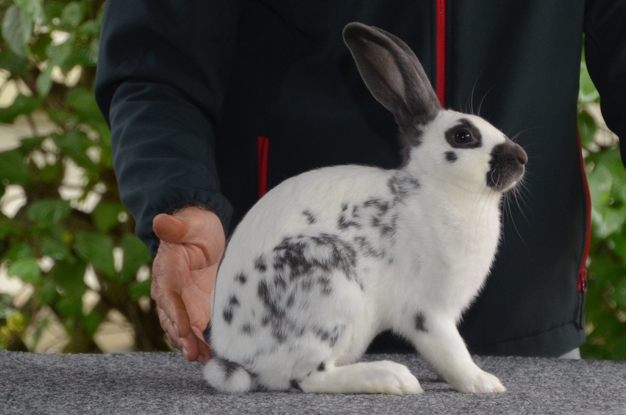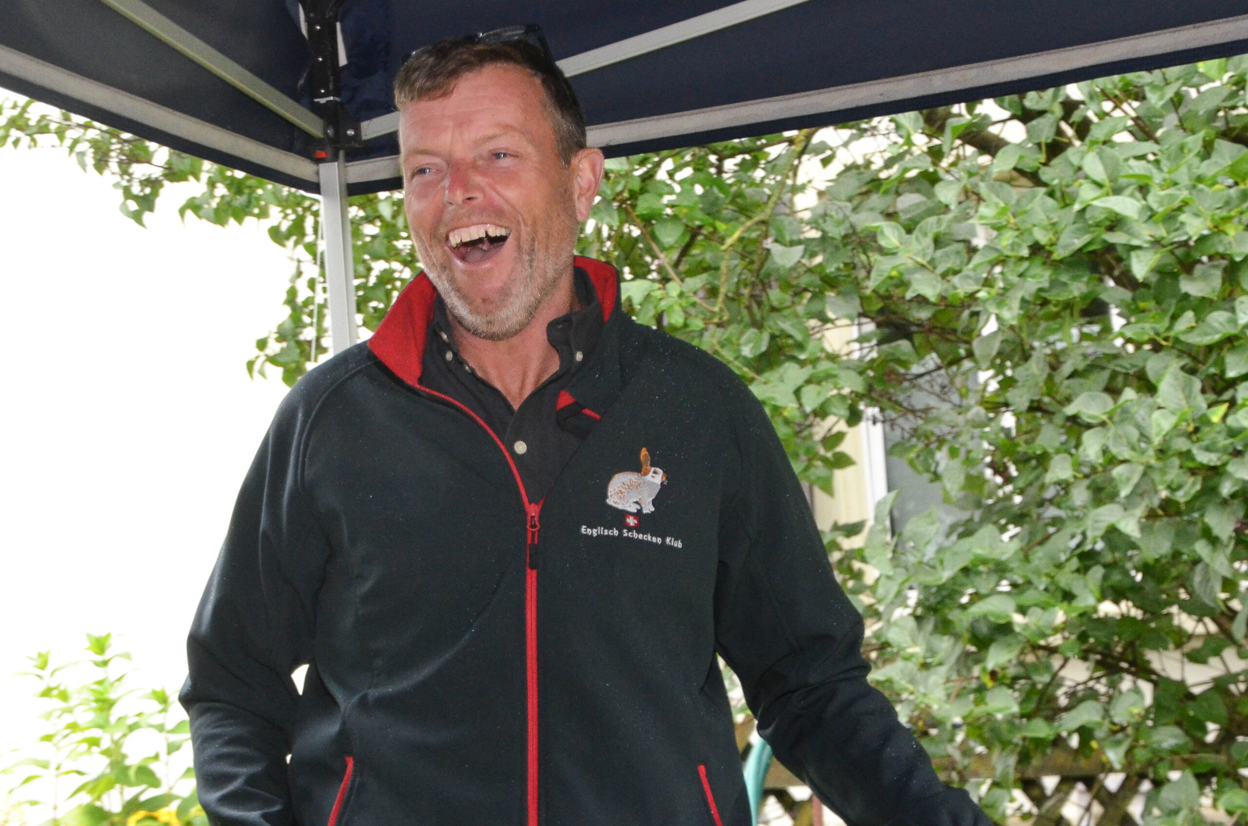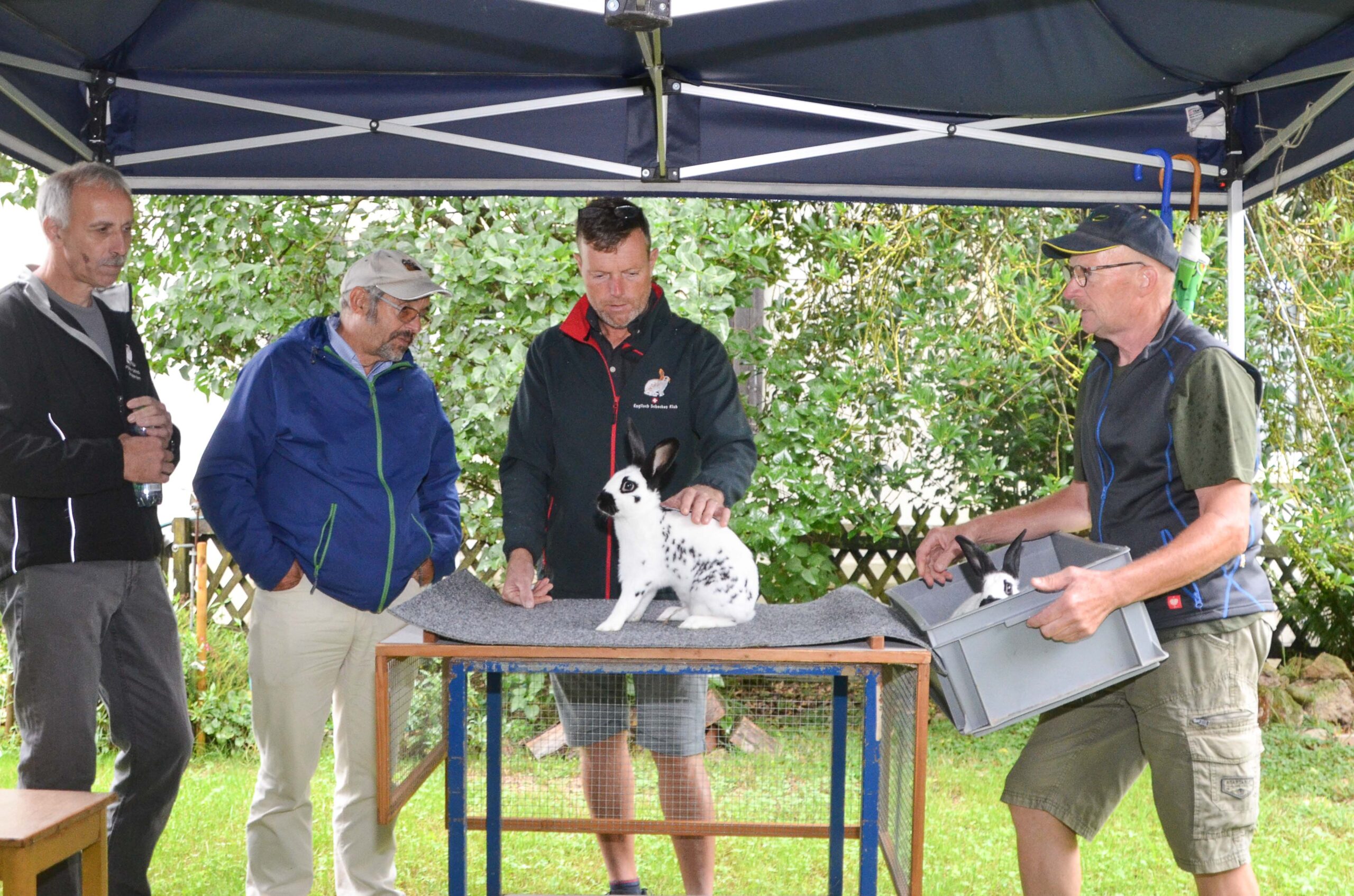 Als zweite Station folgte Düdingen, wo Fredi Aebischer seine schwarzen und blauen Englischschecken züchtet. Vorsorglich hatte er für die Stallschau Zelt-Pavillons aufgestellt, sodass niemand nass wurde. Daniel Rubin durfte sehr ausgeglichene Tiere kommentieren und auf viele positive Eigenschaften hinweisen.